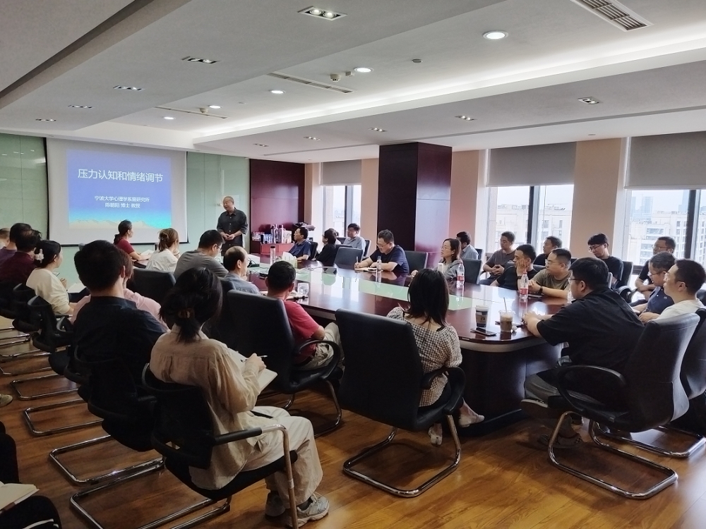 為了幫助員工理解壓力的本質(zhì)和情緒調(diào)節(jié)的方法,關(guān)愛員工身心健康,增強心理保健意識,學會科學調(diào)適心理,緩解心理壓力,10月16日下午,集團公司攜手投資公司、東元創(chuàng)投、信紀公司、電子行業(yè)協(xié)會、科寧達公司、東旭公司等7家公司50余位干部員工在公司22樓會議室開展了《壓力認知與情緒調(diào)節(jié)》培訓會。此次培訓在上級工會大力支持下,經(jīng)過精心組織和籌劃,特別邀請了寧波大學陳朝陽教授及團隊成員為我們授課。