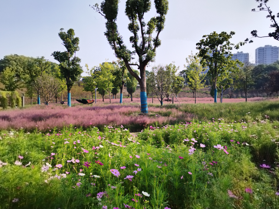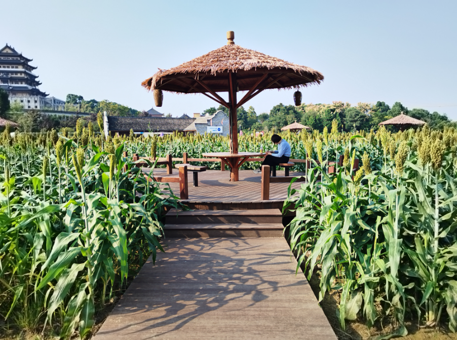 奉化仁湖農(nóng)趣園是集生態(tài)防護(hù)、景觀觀賞、農(nóng)田種植、休閑健身、文化娛樂(lè)等功能于一體的大型城市森林公園。公園整體設(shè)計(jì)按照“山為實(shí),水為虛”的古代山水理念,獨(dú)具匠心地體現(xiàn)奉化所特有的山水人文特色和彌勒佛教文化。一走進(jìn)園區(qū)大門,成片的高粱地與水稻田交相輝映,整齊劃一,一個(gè)個(gè)高粱穗,似一只只火把,伸向藍(lán)天,訴說(shuō)著豐收的喜悅。木質(zhì)連廊將高粱地分割得錯(cuò)落有致,大家登上連廊,在周圍高粱簇?fù)硐?,紛紛拿出手機(jī)與高粱來(lái)個(gè)親密接觸,記錄著美麗瞬間。在園區(qū)內(nèi)還有農(nóng)作物科普小知識(shí),大家駐足閱覽,仿佛身在城里的我們走進(jìn)了鄉(xiāng)間田野。